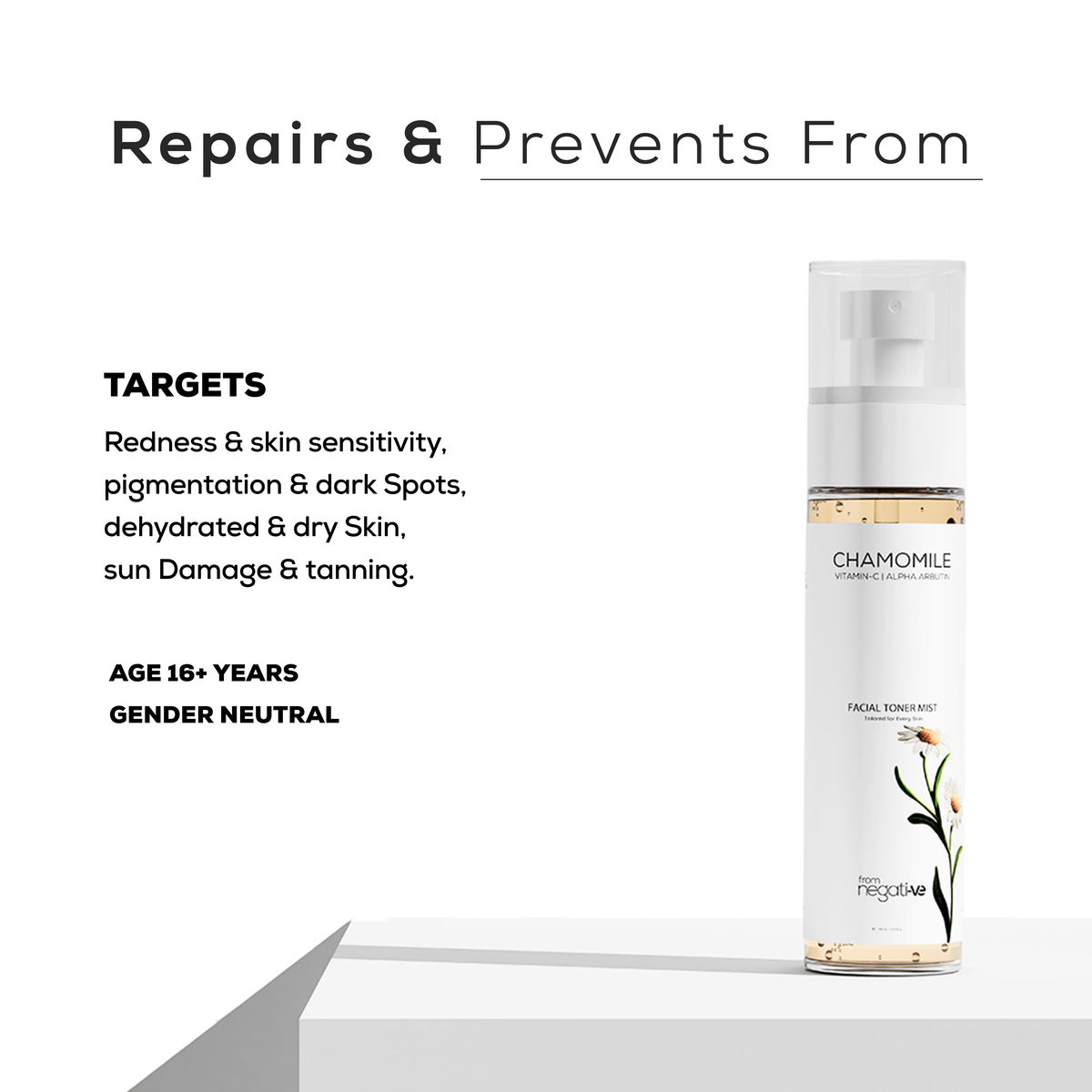 The Chamomile Vitamin-C Toner Mist by From Negative is designed to refresh, brighten, and hydrate the skin while preparing it for the rest of your skincare routine.